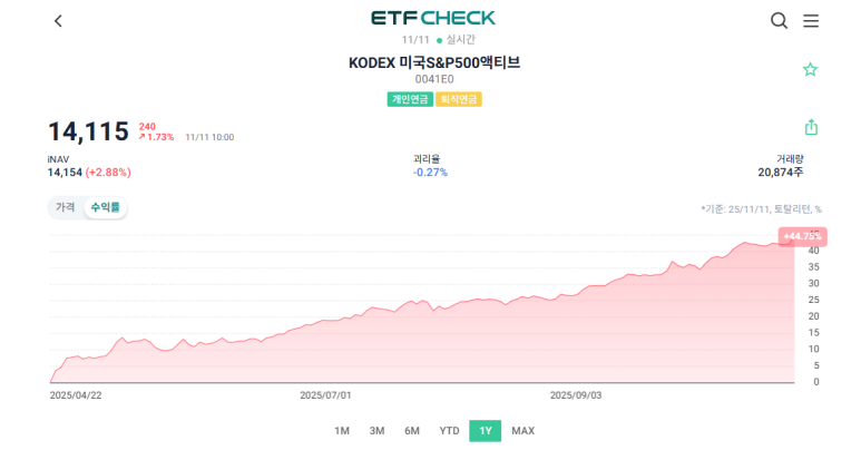 - 패시브 ETF의 선방: KODEX 미국S&P500 ETF가 지난 1년간 20.46%라는 매우 높은 수익률을 기록했다는 것은, 이 기간 동안 S&P 500 지수 자체가 매우 좋은 성과를 냈다는 것을 의미합니다. 패시브 전략이 성공한 시장이었습니다.